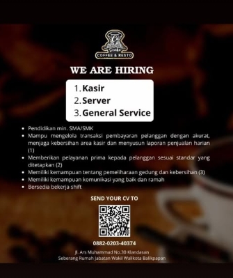 Send your CV to : 0882020340374/ Jl Ars Muhammad No 30 Klandasan, seberang rumah jabatan wakil Walikota Balikpapan